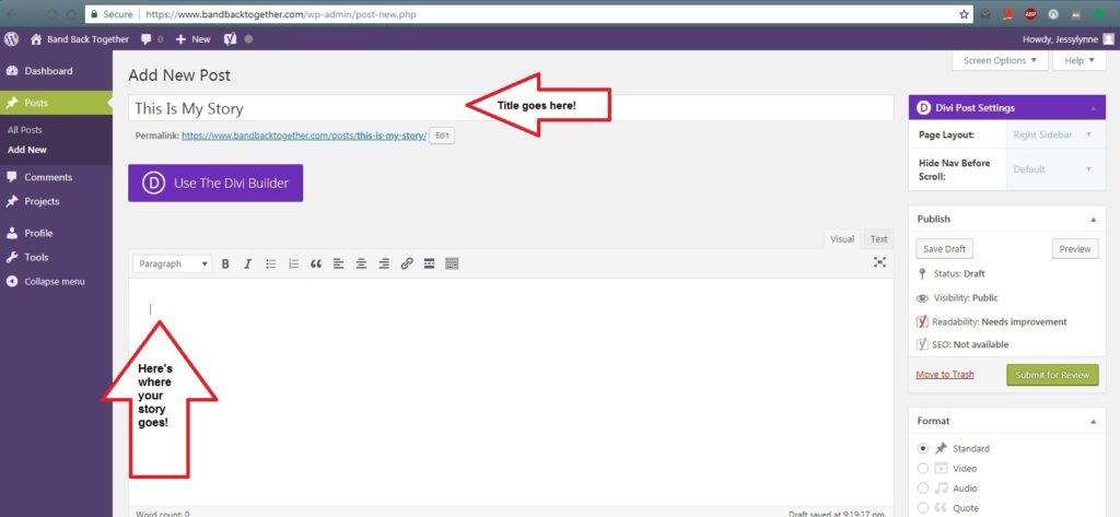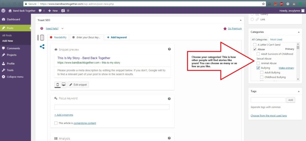 Here you will insert your title, write and edit your story!! If you’ve ever used microsoft word, or really any other blogging/editing platform, this should feel very familiar to you. You have a menu for BOLD, Italics, bulletpoint and numbered lists, insert a block quote, change your word alignment to left, center, or right, insert links to other sites or other pages/stories within our community, insert a “Read More” tag, and you can toggle for even more editing tools!