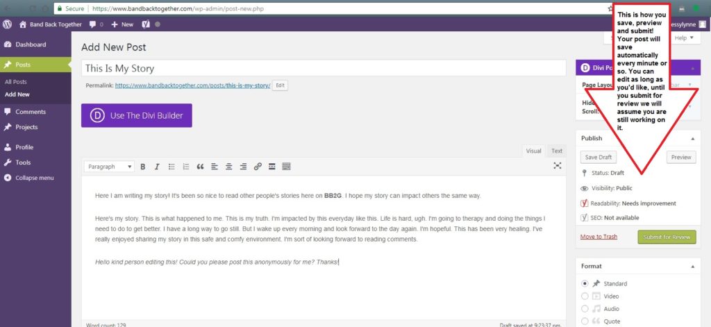 When you’re satisfied with the look you’ll need to hit the “Submit For Review” button. If you don’t submit your story we will assume you are still working on it and it will stay in your editing screen indefinitely: